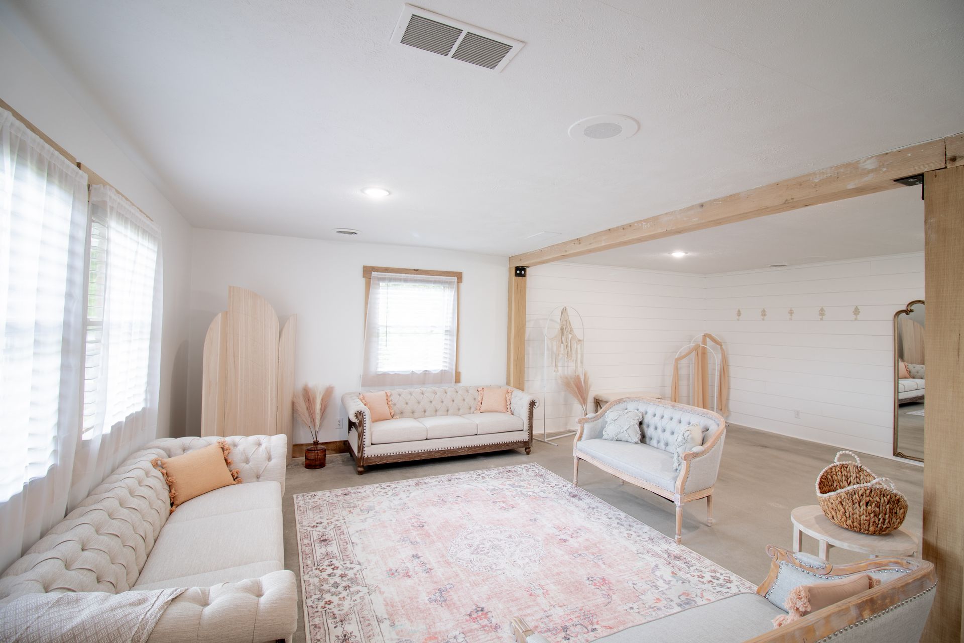 Designed with the modern bride in mind, our spacious bridal suite blends contemporary luxury with the soaring, airy feel of our modern barn architecture. This private sanctuary serves as the perfect home base for your wedding morning, featuring a dedicated hair and makeup bar, a photo-ready backdrop wall for your "getting ready" portraits, and custom dress hooks to showcase your gown. Between final touches, you and your party can relax in our plush lounge seating or enjoy a refreshment from the private coffee bar and mini-fridge. Complete with an elegant attached bathroom and an abundance of natural Indiana light, it’s a space crafted for comfort, celebration, and those quiet, beautiful moments before the ceremony begins. Take a look at our bridal suite gallery and find the inspiration you've been looking for!